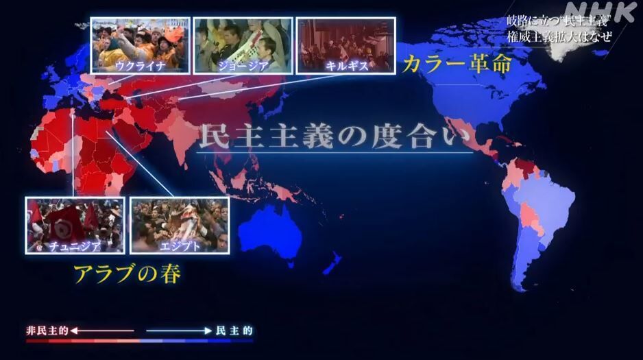 2022年10月31日 Nスペ、混迷の世紀 第3回は、 テーマが「岐路に立つ民主主義~権威主義拡大はなぜ~」でした。第1回、いやプロローグの回から見ています(この日のブログ参照)。第3回でも登場した「民主主義の度合い」地図。この色分けが新たな分断線を可視化しています。公式サイトでは、番組内容を次のように紹介(↓)。シリーズ混迷の世紀・第三回は、岐路に立つ“民主主義”に迫る。ロシアのウクライナ侵攻以来、EUは“民主主義陣営”の結束を訴えるが、いま、その足もとが揺らいでいる。ウクライナからの避難者を最も受け入れているポーランドでは、財政がひっ迫する中、EUへの反発が高まっている。ハンガリーでは、強権的な指導者の下、民主主義の理念が大きく揺らいでる。世界各地で権威主義的な国が台頭する中、世界はどこへ向かうのか。---番組の中でも指摘されていたとおり、民主主義は「社会や経済の安定がないと根付かないデリケートな制度」なのです。だから、「カラー革命」や「アラブの春」を経て、民主的な動きがあった国々でも、今はそれとは逆行した状況になってしまっています(↓)。日本にも諺がありました、「衣食足りて礼節を知る」と。EUがポーランドに求めたモノは、民主主義の「前」に「衣食」ではなくその逆(ウクライナからの難民対策に必要な援助を受けるためには、EUが求める自由民主主義的指標をクリアしなければいけない)。これまでEU加盟国の中にあった格差が、ここでも可視化されてきていて、そりゃあポーランド市民から次のような発言も飛び出しますよ(↓)。久しぶりに聞いたな、「二級市民(二等市民)」という言葉。こーゆー状況を中国が見ています。そして「ウチみたいに(強権主義的な政治体制で)やっても、ちゃんと国は発展しますよ」と、手を差しのべるのです(経済的な提携・協力体制を構築)。ハンガリーの報道官は、こう、宣う(↓)。(ハンガリーはEUと足並みをそろえず、ロシアとの経済的な友好関係を続けています。)で、先日、現代ビジネスから転載されたYahoo!ニュースを思い出しました(出典元はこちら)。導入部で紹介されている日経の記事(↓)。〈米ニューヨークで開催中の国連総会は3年ぶりの対面会議となったが、国連改革など具体的な成果は見えない。混迷の背景に強権国家の攻勢に加え、民主主義の劣化とそれに失望した新興国の離反がある。世界の10人に7人が強権国家に住み、民主主義はいまや3人未満――。英オックスフォード大の研究者らが運営する「アワー・ワールド・イン・データ」の調査でこんな傾向がわかった〉(日本経済新聞「民主主義国の人口、世界で3割未満に 新興国が離反」2022年10月1日)---日本で報道されるニュースは欧米のフィルターを通したものが多いため、「実はそれ、人口比では少数派のフィルターを通ったニュースですよ!」なんて、ゆめゆめ思いません(世界の趨勢だと思ってます)。この記事前半で著者の御田寺圭さんが指摘していたのが、今回のNスペ「混迷の世紀」第3回を先取りした内容でした。後半の指摘(民主主義の隠れた「致命的欠陥」)は、私にとっては目から鱗(「シルバー・デモクラシー」という言葉は知ってはいましたが、民主主義を歴史的に人間の寿命と結びつけて考察するというのは、慧眼です)。民主主義陣営は、“agree to disagree”というスタンスを、強権主義的な主張も包摂しながら存続していきます。一方の強権主義陣営の指導者は、一度、手にした権力を手放しません。そして自らを絶対化するのです(あぁ、怖ぁ~、ニンゲンなんて、間違える動物なのに・・・・( ^.^)( -.-)( _ _))。---今日の南アルプス(↓11:00撮影)。今日のストームグラス(↓)。 タグ :#NHKスペシャル#混迷の世紀#第3回#岐路に立つ民主主義~権威主義拡大はなぜ~#民主主義の度合い